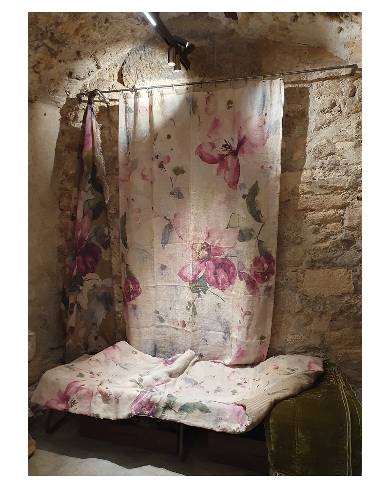 Un chemin-de-lit tissé double étoffe 100% coton imprimé floral au recto, parsemé de pompons bohèmes en coton naturel. Verso en coton flex rayé couleur noire. Matelassé, garnissage en polyester. Nouettes en lin aux coins. Dimensions 90x200 cm