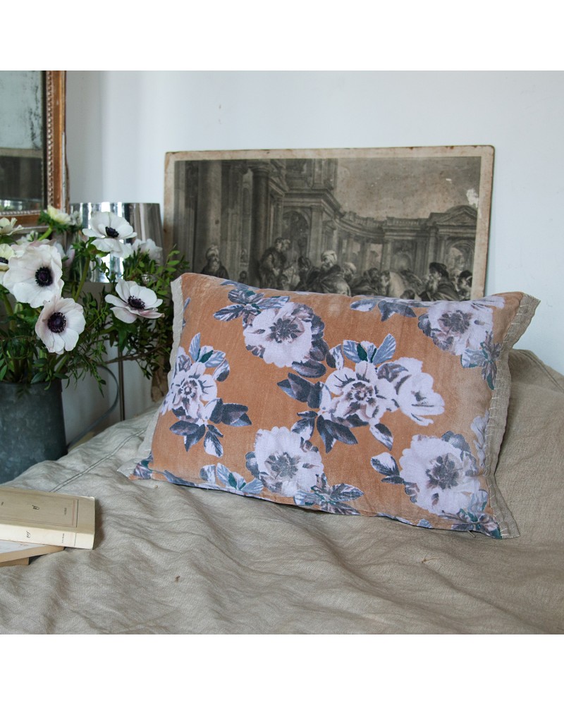 ANEMONE Coussin 35x50 cm en velours de coton imprimé. Déhoussable, Zip pour la fermeture. Bordure en lin sur les 2 petits côtés