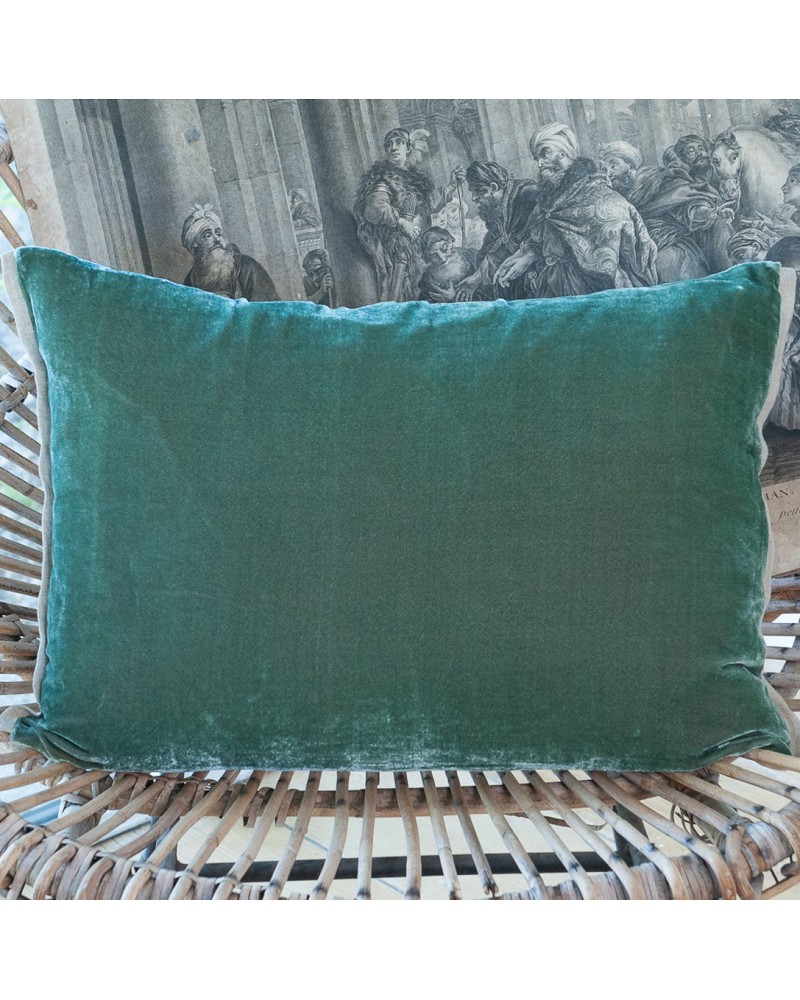 Un coussin en 100% velours de soie monochrome au recto, en 100% lin naturel au verso avec un passepoil en toile de lin écru sur chacun des deux petits côtés. Déhoussable, zip pour la fermeture. Dimensions 35x50 cm. Fortuna nous fait remonter le temps du côté de chez Swann. Notre madeleine de Proust diffuse une élégance totale, voire aristocratique, tout en douceur et subtilité. On rêve d’un palais vénitien, d’une atmosphère viscontienne. Une caresse spirituelle.