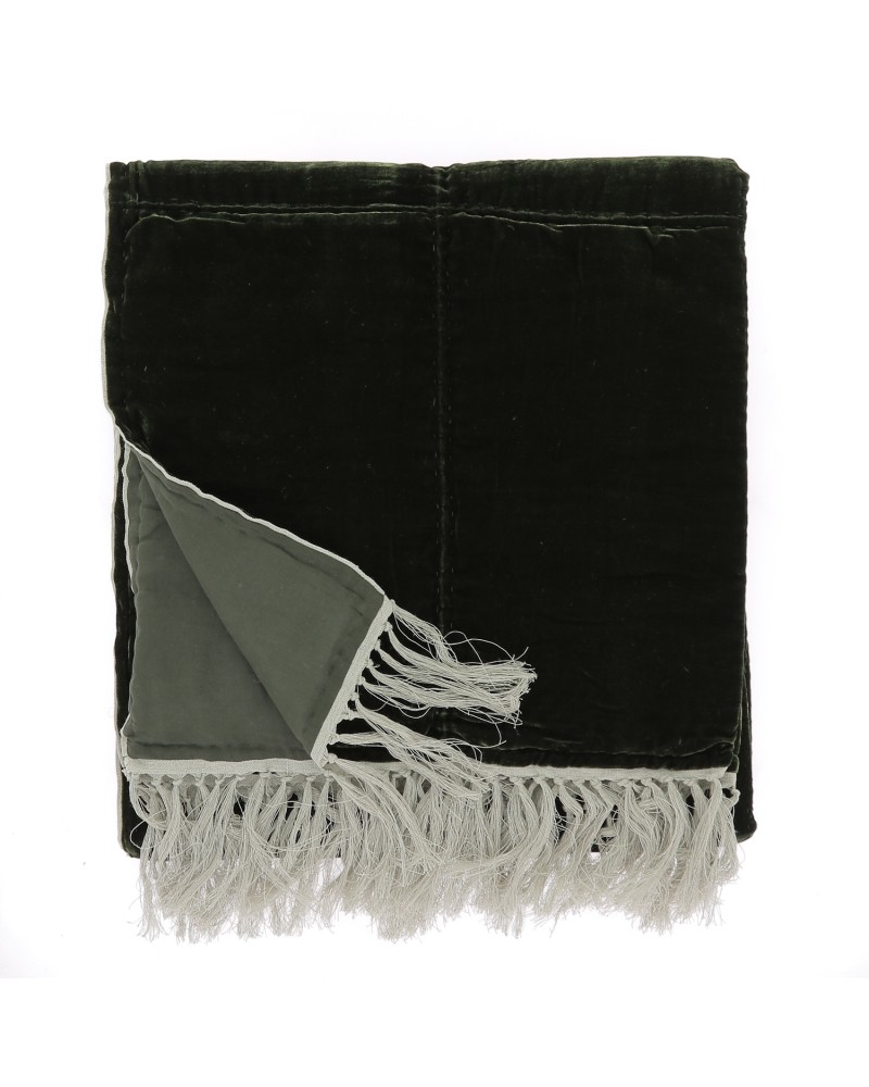 Un dessus de lit surpiqué 100% velours de soie sur le dessus, envers en 100% coton ton sur ton, un délice de légèreté. Finition franges sur les 2 petits côtés. Dimensions 230x250 cm.  Fortuna nous fait remonter le temps du côté de chez Swann. Notre madeleine de Proust diffuse une élégance totale, voire aristocratique, tout en douceur et subtilité. On rêve d’un palais vénitien, d’une atmosphère viscontienne. Une caresse spirituelle.
