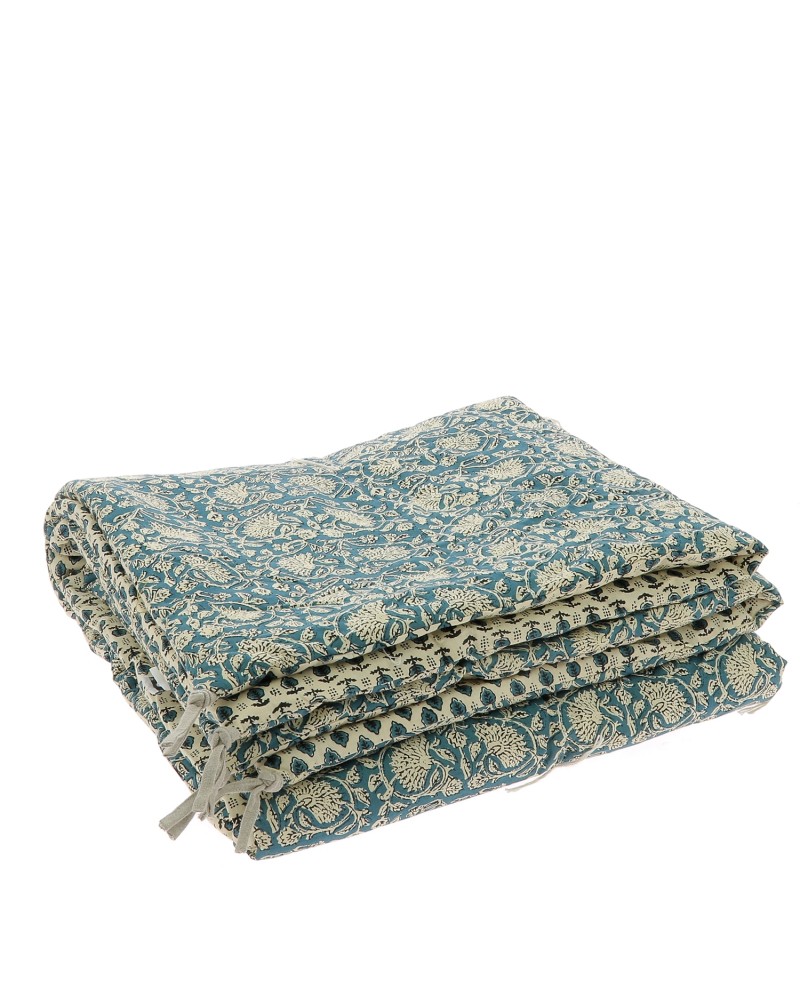 Un édredon 100% coton matelassé, imprimé au block print d'un motif traditionnel Indien, verso en coton imprimé dans la même gamme couleur mais avec un autre motif assorti, avec des nouettes en lin naturel aux quatre coins. De délicats pompons en fils de coton écru de 4 cm se dispersent sur toute la surface. Dimensions 140x220 cm.